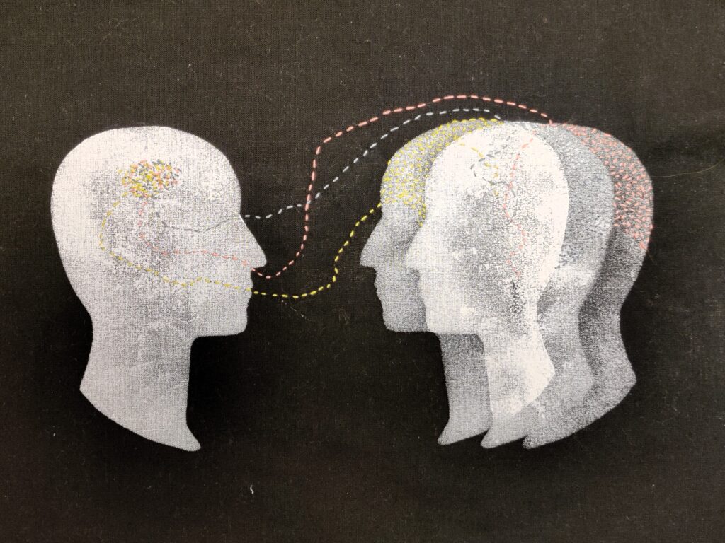 Kirjottuja yhteyksiä (kangas, kirjontalanka, akryylimaali), Kaisa Torkkeli 2023.
